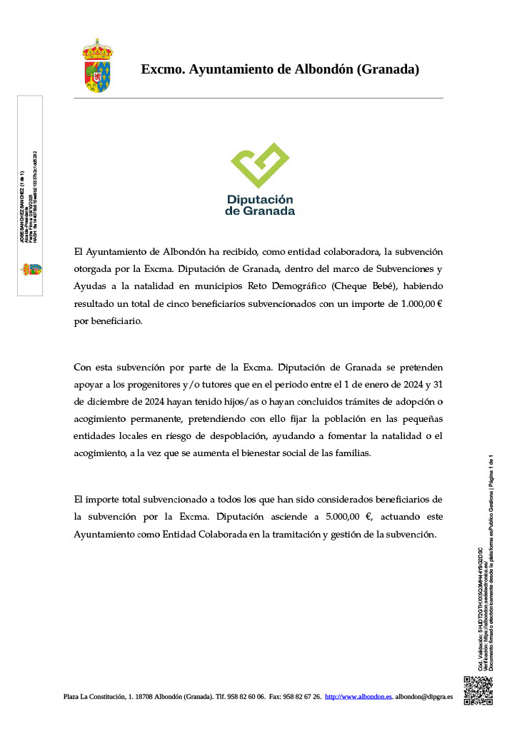 El Ayuntamiento de Albondón ha recibido, como entidad colaboradora, la subvención